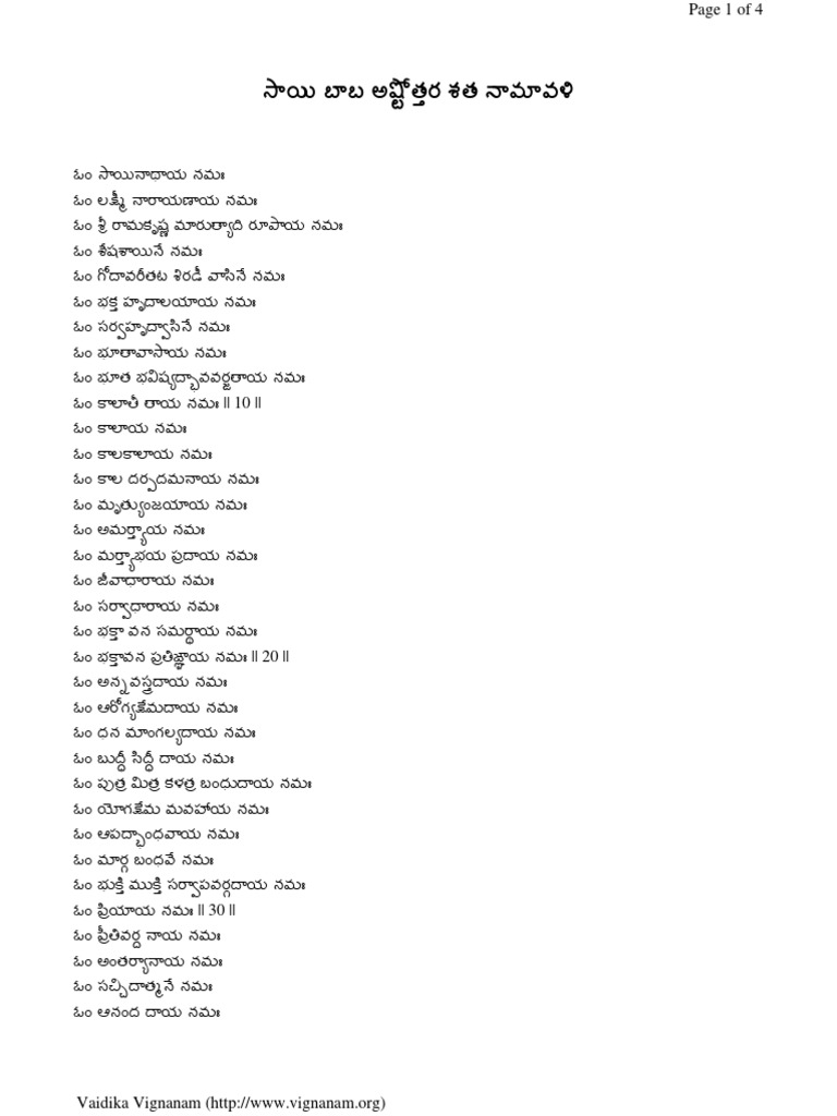 Sri Sai Baba Ashtottara Shatanamavali In Telugu శ్రీ సాయిబాబా Sai Baba Ashtottara Shatanamavali Telugu Get sri shiridi sai baba ashtothram in telugu pdf lyrics here and chant it with devotion for the grace of lord sai baba. శ్రీ షిరిడీ సాయి అష్టోత్తర శతనామావళి. నిత్య పూజలకు సాయి బాబా అష్టోత్రం, సాయి సత్చరిత్ర పారాయణం ఎంతో శ్రేయోభిదాయకం. ఓం శ్రీ సాయి నాథాయ నమః. sri shiridi sai ashtottara satanamavali lyrics in telugu. భక్తుల పాలిట పెన్నిధిగా పేరుపొందిన సాయినాథుని ప్రార్ధించుటలో సాయి. Sai Baba Ashtottara Shatanamavali Telugu.